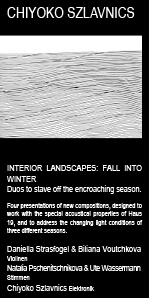 | © CHIYOKO SZLAVNICS CHIYOKO SZLAVNICS Interior Landscapes: Fall into Winter. Duos to stave off the encroaching season. Abb.: Probenaufnahmen von Biliana Voutchkova, Daniella Strasfogel und Marc Sabat, Fotos von Michael Bruner. |